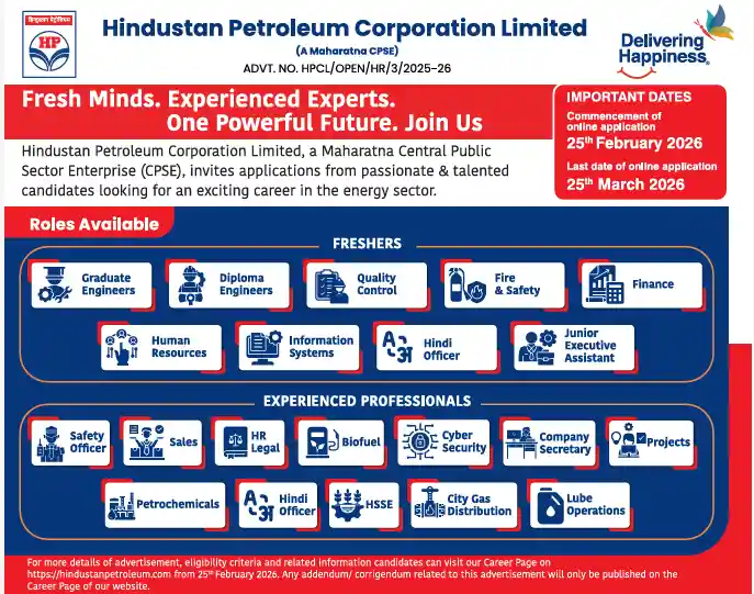 आवेदन 25 फरवरी 2026 से शुरू होंगे और 25 मार्च 2026 तक चलेगे। ऑनलाइन आवेदन hindustanpetroleum.com की कैरियर पेज पर करना होगा। फुल नोटिफिकेशन उसी दिन जारी होगी।