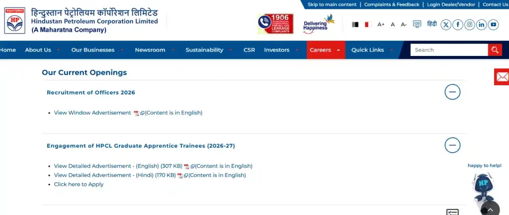 - सबसे पहले HPCL की आधिकारिक वेबसाइट hindustanpetroleum.com पर जाएं।