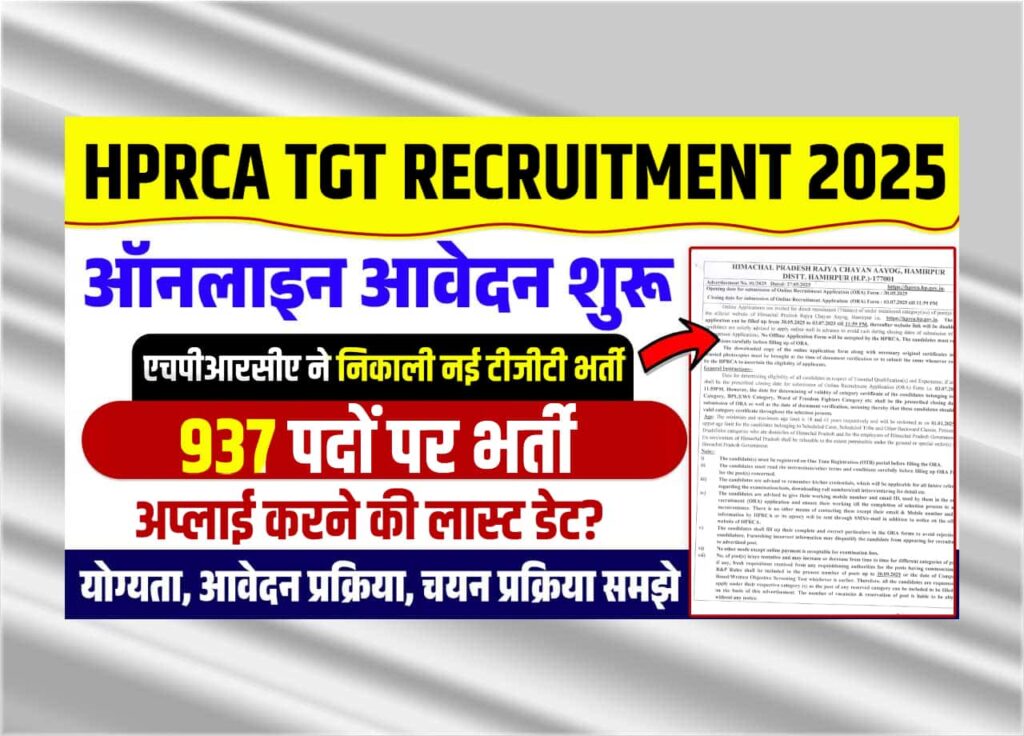 हिमाचल प्रदेश राज्य चयन आय़ोग द्धारा जारी इस HPRCA TGT Recruitment 2025 के तहत रिक्त कुल 937 पदों पर भर्तियां की जाएगी जिसमे सभी आवेदक 30 मई, 2025 से लेकर आगामी 03 जुलाई, 2025 तक ऑनलाइन आवेदन कर सकते है और नौकरी पाने का बेहतरीन अवसर प्राप्त कर सकते है तथा