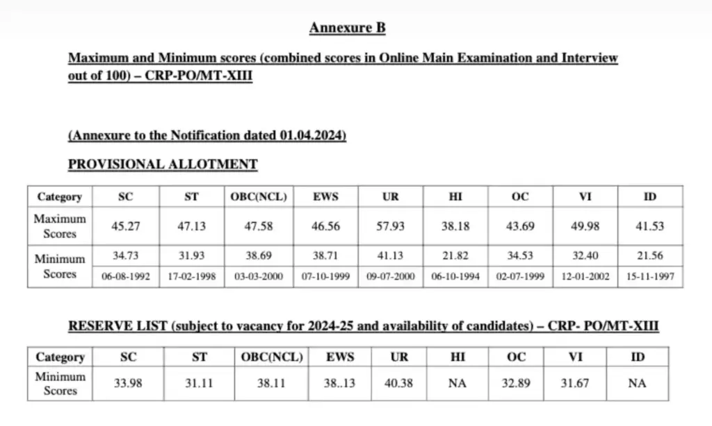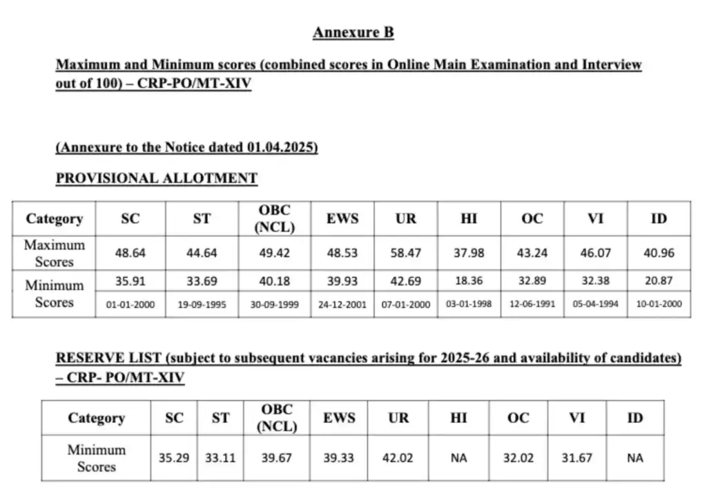 - कैंडिडेट लिंक चेक करें: फाइनल लिस्ट के लिए ‘Listing of Candidates Provisionally Allotted beneath CRP-PO/MTs-XIV’ पर क्लिक करें और केटेगरी सेलेक्ट करके रिजल्ट कट-ऑफ के साथ चेक कर सकते हैं ।