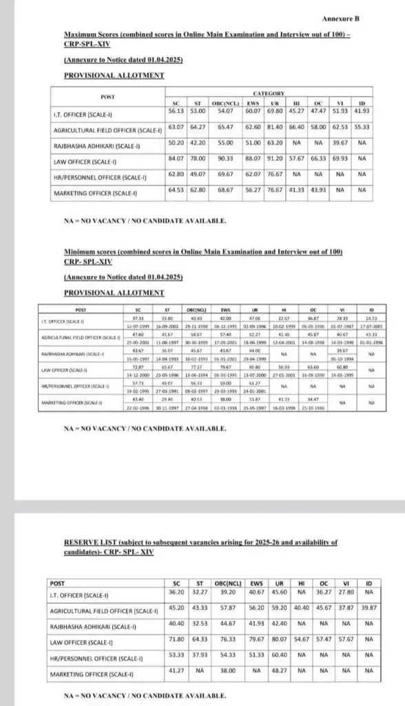 कैंडिडेट लिस्ट चेक करें: फाइनल लिस्ट के लिए ‘Record of Candidates Provisionally Allotted below CRP-SO/SPL-XIV’ पर क्लिक करें और केटेगरी सेलेक्ट करके रिजल्ट कट-ऑफ के साथ चेक कर सकते हैं ।