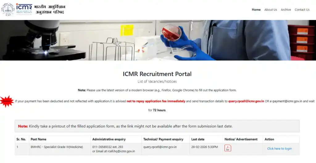 - सबसे पहले आपको ICMR Recruitment के पोर्टल recruitment.icmr.org.in पर जाना होगा।