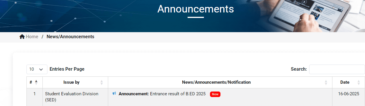 • अब इस पेज पर आपको Entrance results of B.ED 2025 का विकल्प मिलेगा जिस पर आपको क्लिक करना होगा,