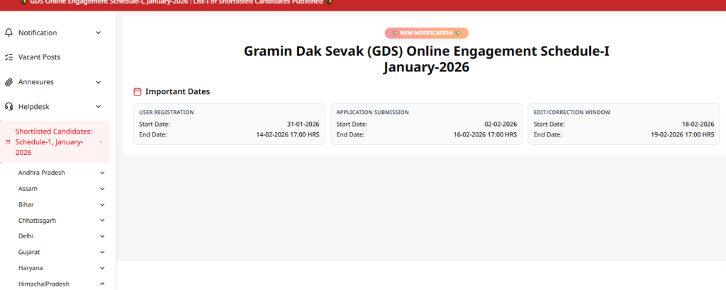 आपकी जानकारी के लिए बता दें कि इस भर्ती के लिए आवेदन 31 जनवरी 2026 से ऑनलाइन माध्यम से शुरू हो चुके हैं। और जो भी इच्छुक और योग्य उम्मीदवार इन पदों के लिए आवेदन करना चाहते हैं, वे 16 फरवरी 2026 तक India Submit GDS की आधिकारिक वेबसाइट indiapostgdsonline.gov.in पर जाकर आवेदन कर सकते हैं। आवेदन की पूरी प्रक्रिया आपको इस लेख में मिल जाएगी।