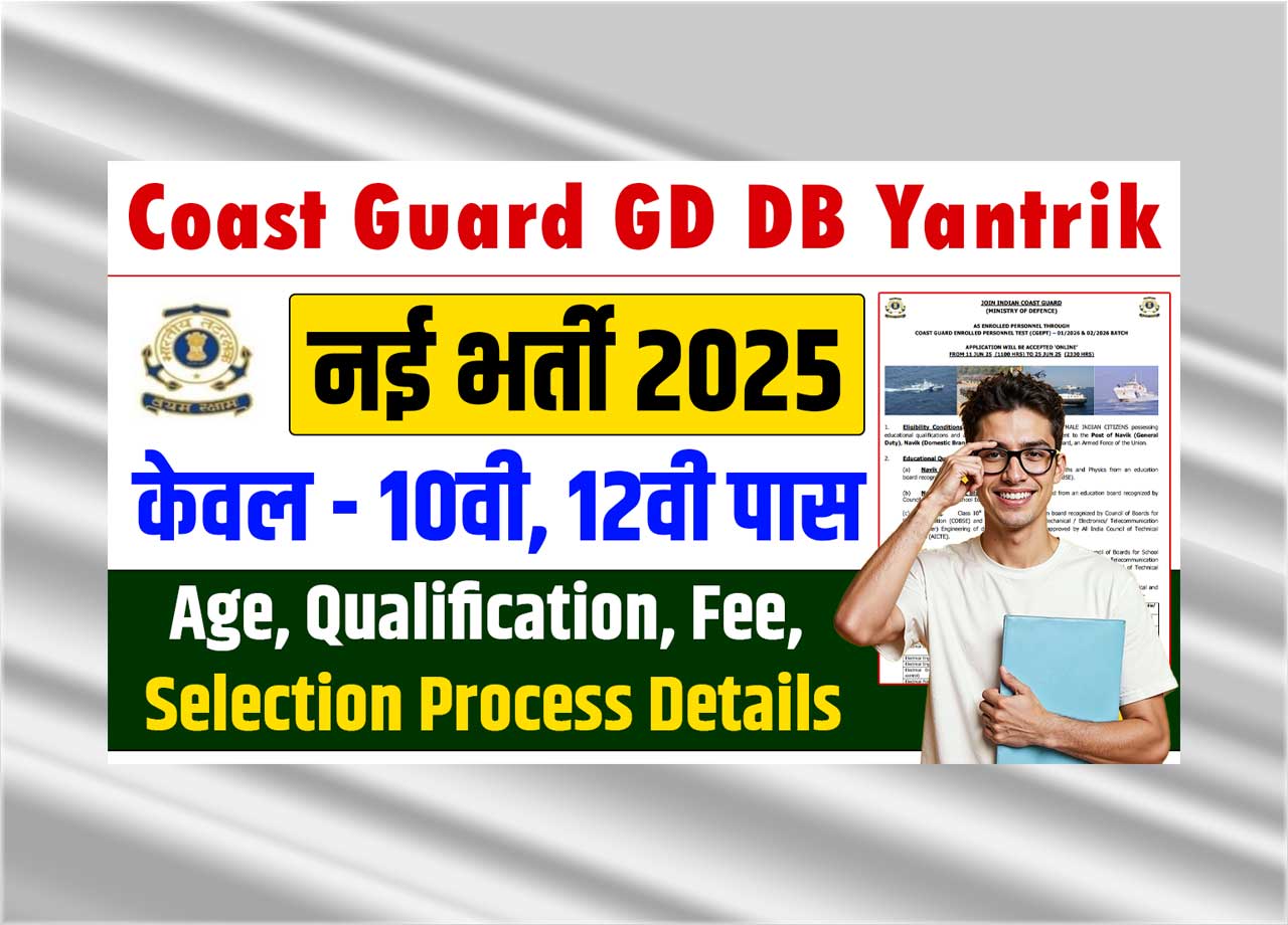 10वीं / 12वीं पास युवाओं हेतु इंडियन कोस्ट गार्ड ने निकाली नाविक व यांत्रिक की नई भर्ती, जाने क्या है पूरी भर्ती, आवेदन प्रक्रिया और अप्लाई करने की लास्ट डेट – Indian Coast Guard GD DB Yantrik Recruitment 2025?