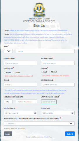 Step 1 – Create New Account Earlier than On-line Apply In Indian Coast Guard GD DB Yantrik Recruitment 2025