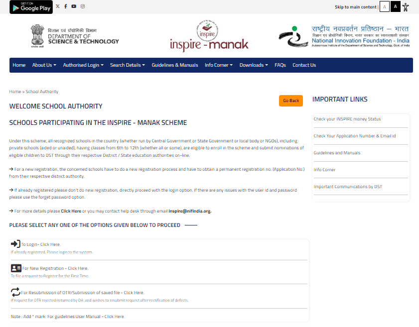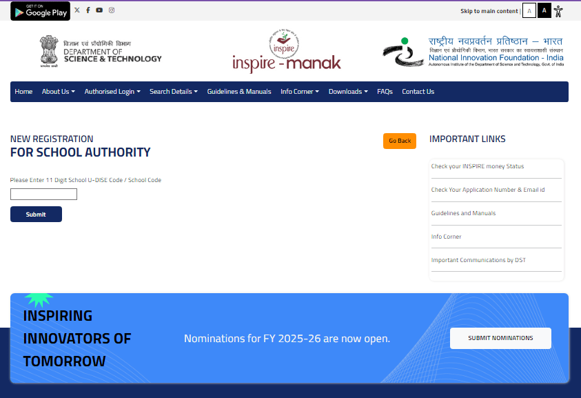 वे सभी स्कूल्स जो कि, इस इंस्पायर अवॉर्ड 2025 – 2026 हेतु इंस्पायर पोर्टल पर अपना – अपना रजिस्ट्रैशन करना चाहते है उन्हें कुछ स्टेप्स को फॉलो करना होगा जो कि, इस प्रकार से हैं –