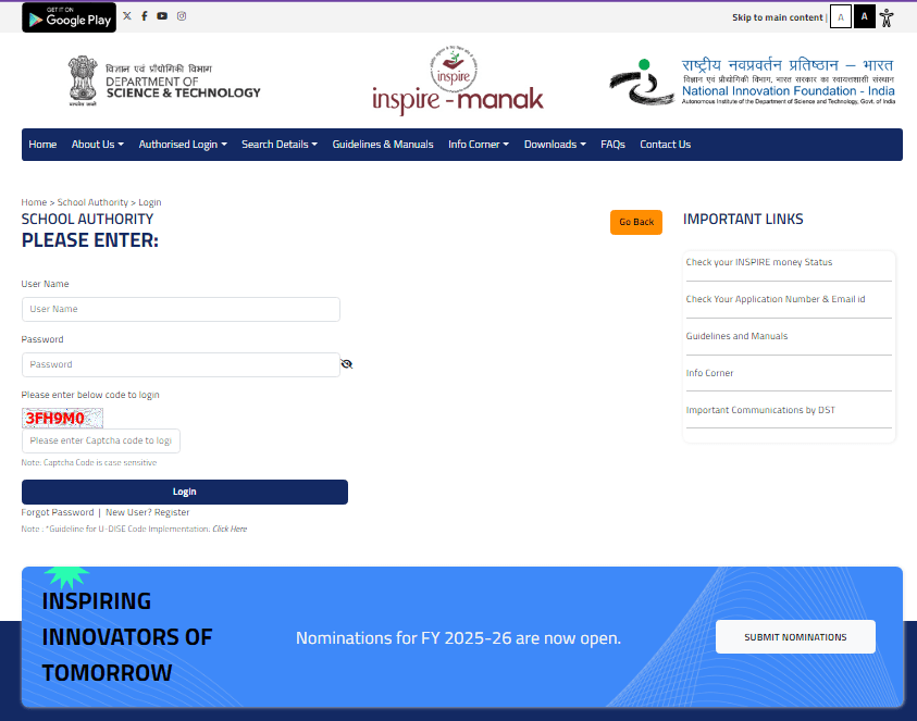 स्टेप 2 – रजिस्ट्रैशन के बाद स्कूल्स को पोर्टल मे लॉगिन करके INSPIRE Award 2025-26 के लिए नॉमिनेशन दर्ज करना होगा
