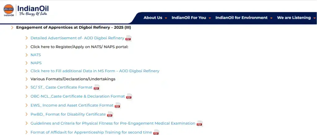 - नया पेज ओपन होगा, यहाँ पर आपको ‘Engagement of Apprentices at Digboi Refinery – 2025 (III)’ सेक्शन में ‘NATS/ NAPS portal’ का लिंक मिल जाएगा।