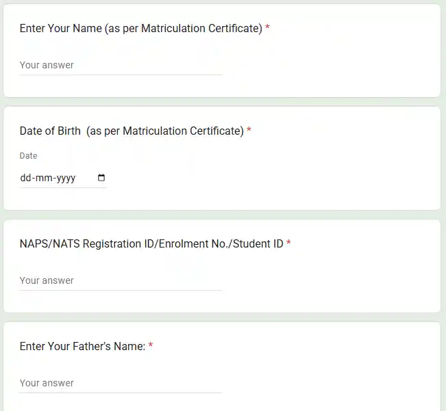 - Google Kind ओपन होगा, इसमें मागि हुई सारी जानकारी को अच्छे से भरें, NAPS/NATS एनरोलमेंट नंबर डालें। और Declaration को टीक करके फॉर्म submit कर दें।