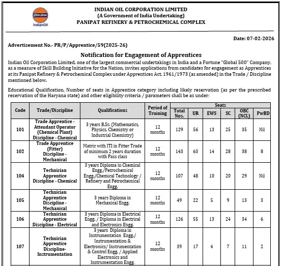 IOCL Panipat Refinery Apprentice Notification 2026: Particulars