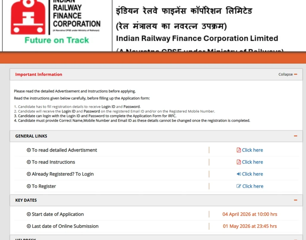 आपकी जानकारी के लिए बता दें कि यह भर्ती पूरे भारत के उम्मीदवारों के लिए निकाली गई है। अगर आप भी इस भर्ती के लिए आवेदन करना चाहते हैं तो आवेदन 4 अप्रैल 2026 से शुरू हो चुके हैं। जो भी इच्छुक और योग्य उम्मीदवार हैं, वे 1 मई 2026 शाम 11:45 बजे तक IRFC की ऑफिशियल वेबसाइट www.irfc.co.in पर जाकर ऑनलाइन माध्यम से आवेदन कर सकते हैं। आवेदन की पूरी प्रोसेस आपको आगे लेख में मिल जाएगी।