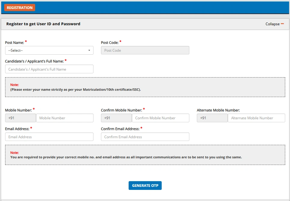 • पहले रजिस्ट्रेशन type नाम, मोबाइल, ईमेल भरें और OTP से वेरीफाई करें।