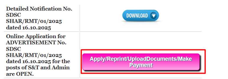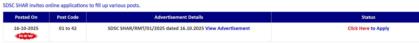- यहां पर आपको SDSC SHAR/RMT/01/2025 वैकेंसी दिखाई देगी इसके आगे आपको Click on Right here to Apply पर क्लिक कर देना है।