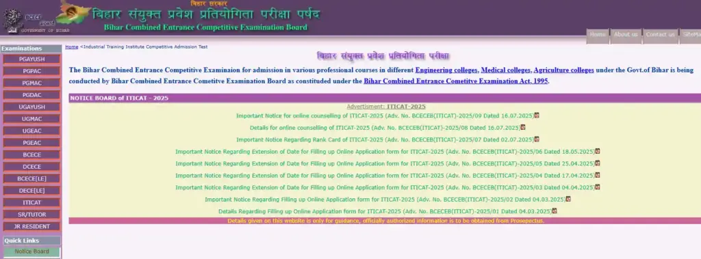 Official Bihar ITICAT 2025 portal where students can apply for ITI Dress Making entrance exam online