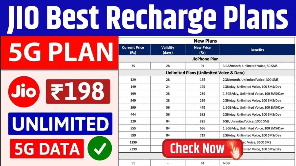 आज के समय मे भारत मे 5G चल रहा है और लगभग सभी स्मार्टफोन 5G आने लगे है। ऐसे मे हर किसी के पास 5G स्मार्टफोन है 5G की अच्छी बात यह है की इसमे 4G के मुकाबले नेट स्पीड काफी तेज मिलती है साथ ही नेट भी अनलिमिटेड मिलता है। ऐसे मे वह लोग जिन्हे ज्यादा डाटा की आवश्यकता होती है वह अच्छे 5G प्लान की तलाश मे रहते है। लेकिन इसके लिए अब आपको कही जाने की जरूरत नहीं है हम आपको नीचे सारणी मे जियो मे सभी True 5G Limitless Plans के बारे मे बता रहे है जिनमे से आपको जो भी अच्छा लगे आप वह कर सकते है।