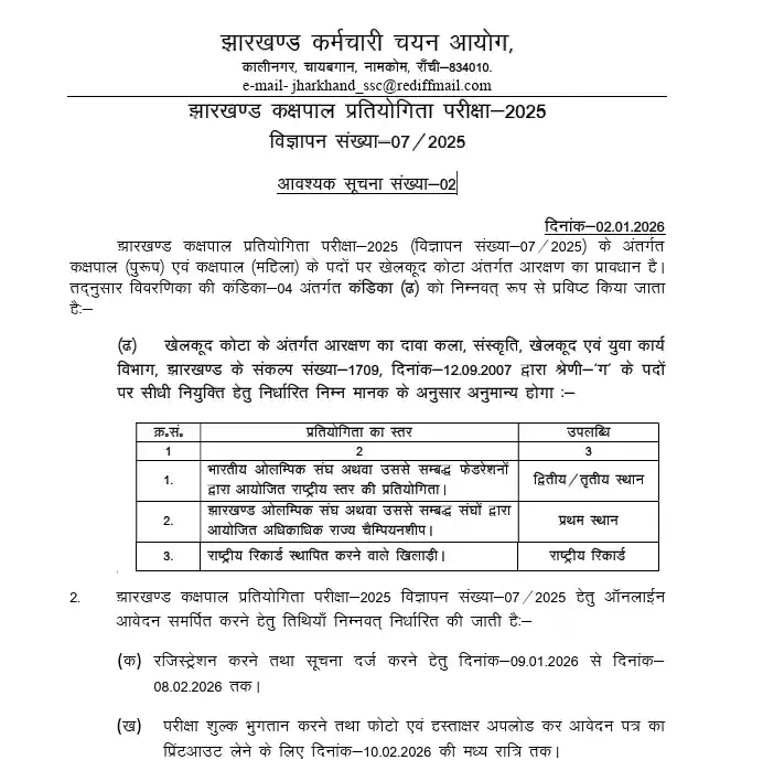 आपकी जानकारी के लिए बता दें कि इस भर्ती के लिए 1634 पुरुष और 64 महिलाओं के लिए पद हैं और बैकलॉग के लिए 35 पद अलग से हैं। इस भर्ती के लिए आवेदन प्रक्रिया 09 जनवरी 2026 से शुरू हो गई है और जो भी इच्छुक और योग्य उम्मीदवार हैं, वे 08 फरवरी 2026 तक JSSC की ऑफिशियल वेबसाइट jssc.jharkhand.gov.in पर जाकर ऑनलाइन माध्यम से आवेदन कर सकते हैं। आवेदन की पूरी प्रक्रिया आपको आगे लेख में मिल जाएगी।