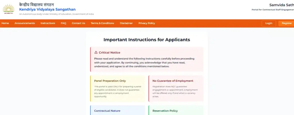 यह पोर्टल Ministry of Training, Authorities of India के चलाया गया है। यहां आप आसानी से रजिस्टर कर सकते हैं, पर रजिस्टर करने के बाद आपको जॉब लगे इसकी कोई गारंटी KVS की नहीं होगी। यह पूरी डिटेल आप रजिस्टर करते समय Necessary Directions for Candidates में पद सकते हैं। कई स्कूलों में फरवरी-मार्च 2026 में आवेदन चल रहे हैं। इसकी पूरी जानकारी आपको आगे लेख में मिल जाएगी, इसलिए लेख को अंत तक पूरा जरूर पढ़ें।