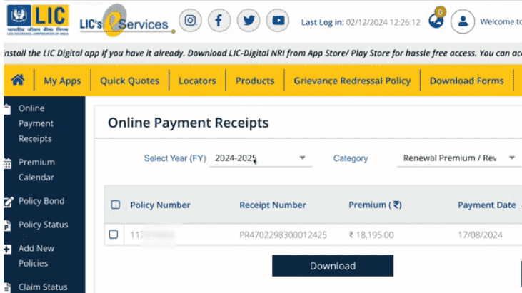 यदि आपको नवीनीकरण प्रीमियम रसीद नहीं मिली है, तो आप किसी भी एलआईसी शाखा या ग्राहक क्षेत्र से प्रीमियम भुगतान प्रमाण पत्र प्राप्त कर सकते हैं। यदि आप एलआईसी पोर्टल (www.licindia.in) पर पंजीकृत उपयोगकर्ता हैं तो आप इसे डाउनलोड भी कर सकते हैं। किसी भी स्थिति में डुप्लीकेट रसीदों को मुद्रित नहीं किया जा सकता है।