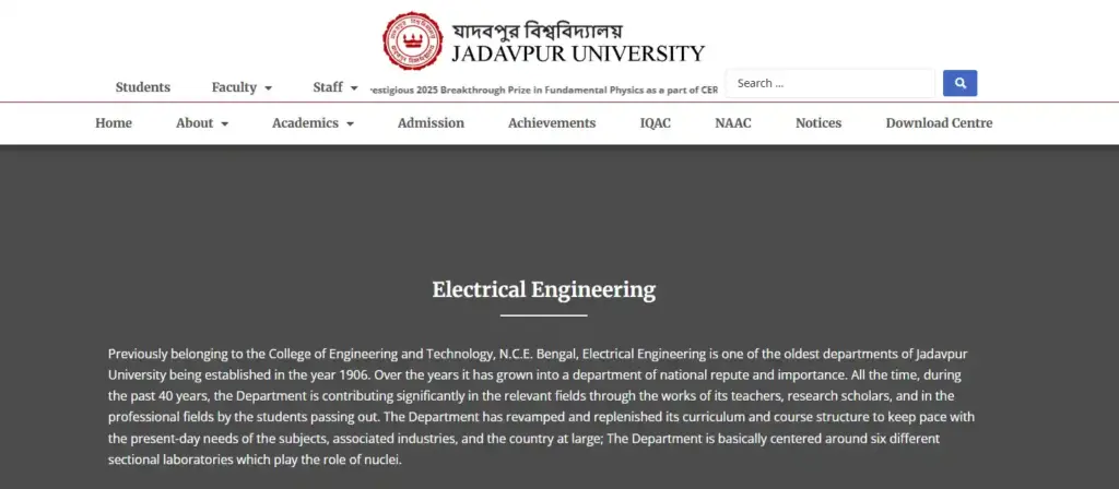 Jadavpur University, Kolkata official website showing Electrical Engineering department offering M.Tech program with national reputation