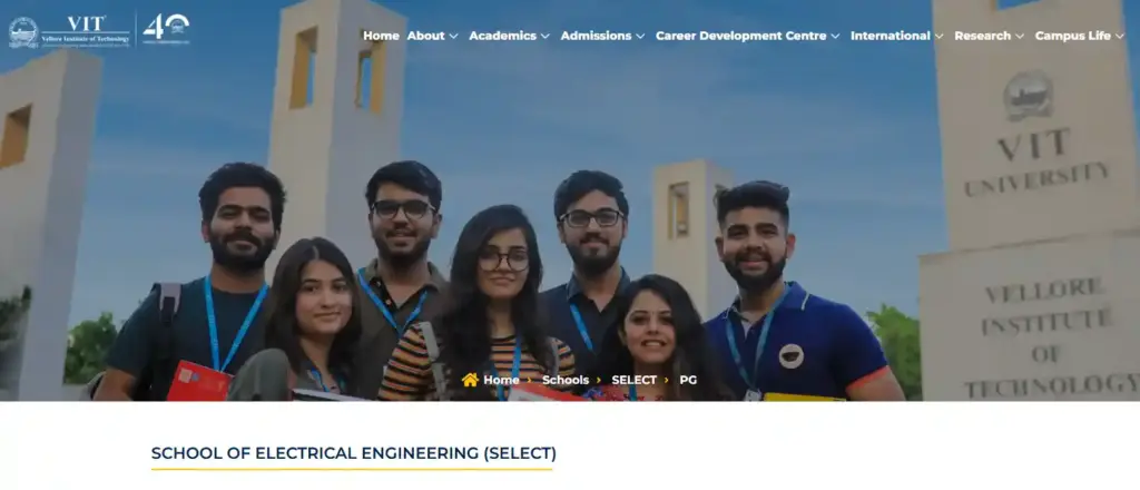 VIT Vellore official website showing School of Electrical Engineering offering M.Tech in Electrical Engineering course