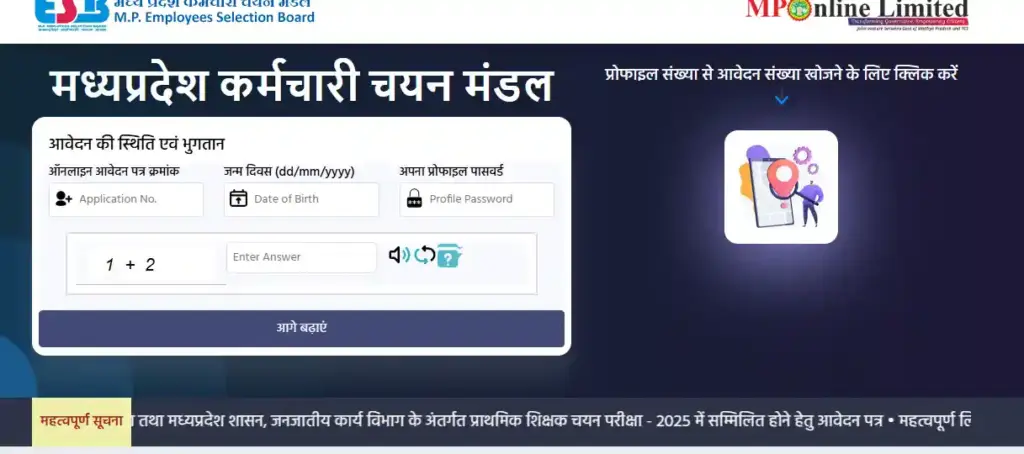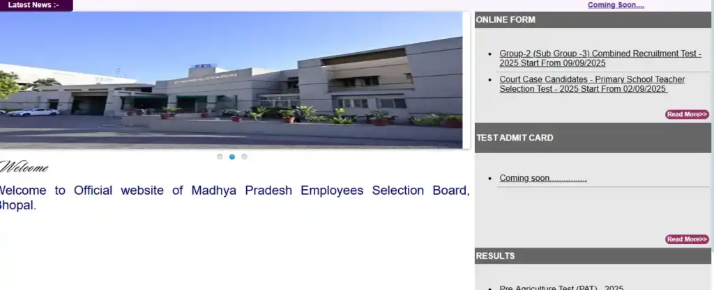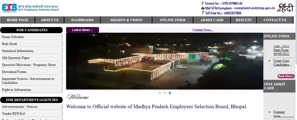 - वेबसाइट पर जाएं: सबसे पहले MPESB की आधिकारिक वेबसाइट esb.mp.gov.in पर जाएँ। होम पेज पर ‘On-line Kind’ सेक्शन वाले हिस्से में ‘Group 2 Sub Group 3 Recruitment 2025’ के लिंक पर क्लिक करें। आवेदन 9 सितंबर से शुरू होंगे।