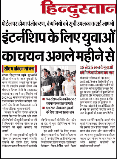 • योजना के तहत आगामी 5 सालों मे 1 लाख युवाओं को इन्टर्नशिप करने का सुनहरा अवसर बिहार सरकार द्धारा दिया जाएगा औऱ