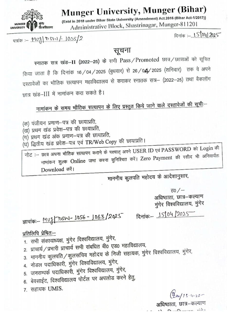 नमस्कार दोस्तों, मुंगेर विश्वविद्यालय के द्वारा शैक्षणिक सत्र 2020-23 से स्नातक कोर्स (BA, BSC तथा BCOM) करने वाले सभी विद्यार्थियों का पार्ट 3 में नामांकन की प्रकिया 16 अप्रैल 2025 से 26 अप्रैल 2025 तक ऑनलाइन के माध्यम से नामांकन अपना सुनिश्चित करेंगे। नामांकन के लिए यूनिवर्सिटी ने अधिकारिक रूप से अधिसूचना भी जारी कर दिया हैं, जिसे आप सभी नीचे देख सकते हैं –