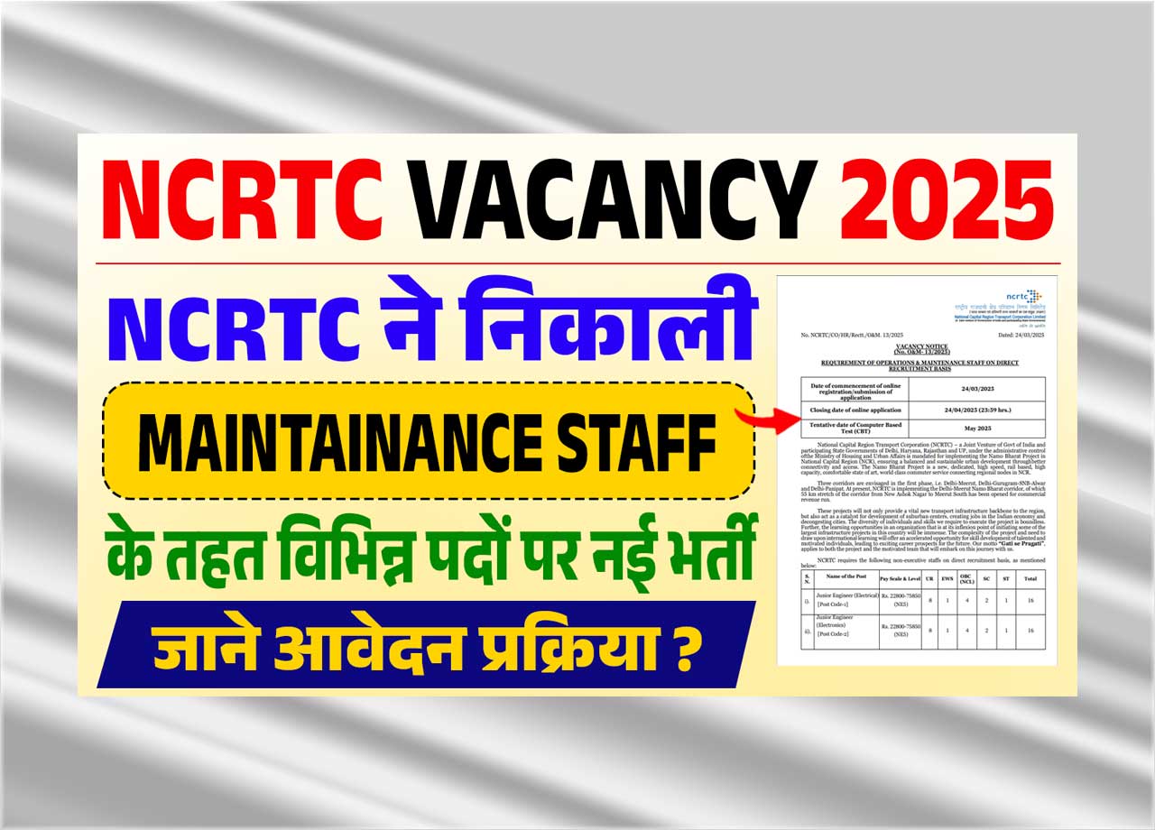 NCRTC ने निकाली Maintainance Employees के तहत विभिन्न पदोें पर नई भर्ती, जाने क्या है पूरी भर्ती, आवेदन प्रक्रिया और आवेदन प्रक्रिया की अन्तिम तिथि – NCRTC Emptiness 2025?