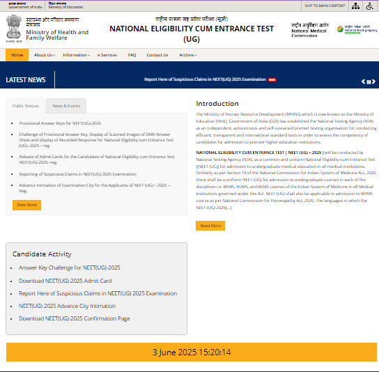 - NEET UG Reply Key 2025 को चेक व डाउनलोड करने के लिए सबसे पहले आपको इसकी Official Web site के होम – पेज पर आना होगा जो कि, इस प्रकार का होगा –