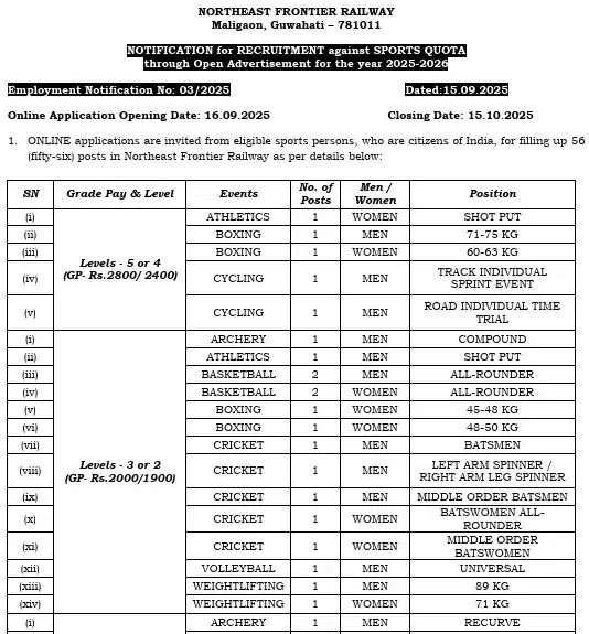 इस साल NFR ने स्पोर्ट्स कोटा के तहत लेवल 5, 4, 3, 2 और 1 में कुल 56 पदों के लिए भर्ती निकाली है।