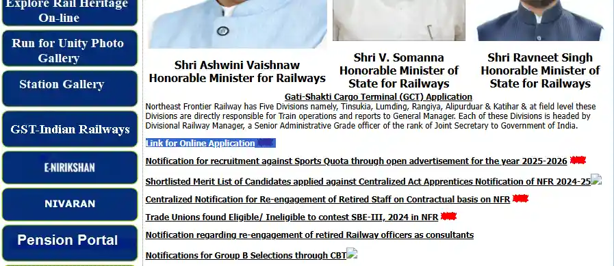NFR websit show Link for Online Application for Northeast Frontier Railway (NFR) Sports Quota Vacancy 2025
