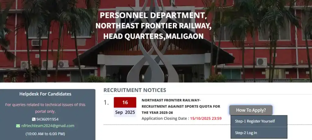 NFR Sports activities Quota Recruitment 2025 के लिए उम्मीदवारों को ऑनलाइन आवेदन करना होगा। नीचे दिए गए स्टेप्स फॉलो करें: