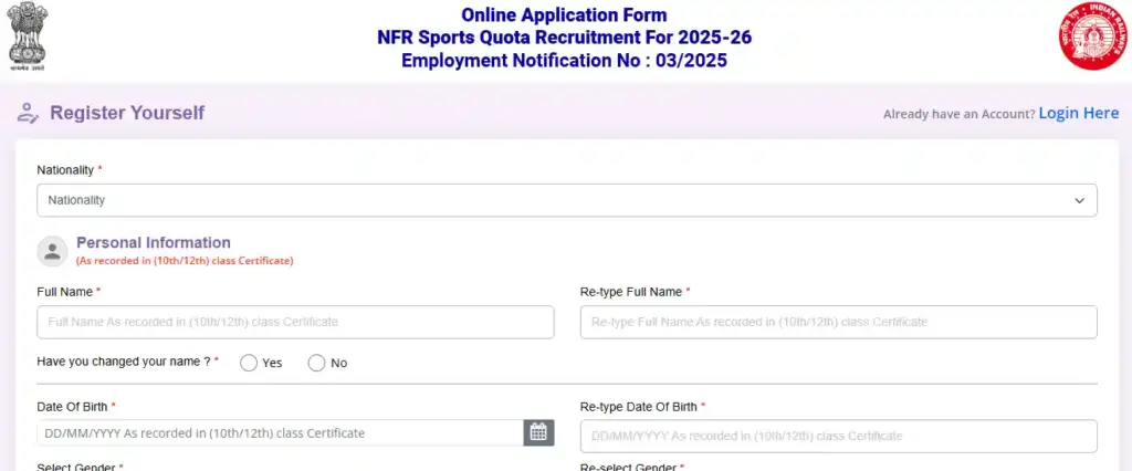 Login for NFR Sports Quota Recruitment 2025