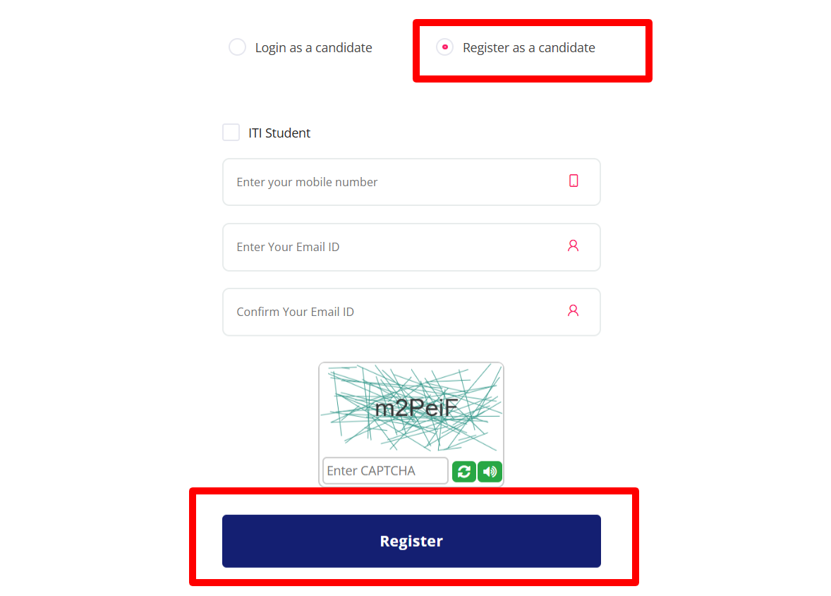 - अब आपके सामने एक नया पेज खुलकर आएगा यहाँ पर आपको Register as a candidate के ऑप्शन पर क्लिक करना है और फिर अपनी आवश्यक जानकारियों को एंटर करके खुद को पोर्टल पर Register कर लेना है।
