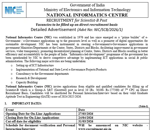 Necessary Dates of NIC Scientist B Recruitment 2026