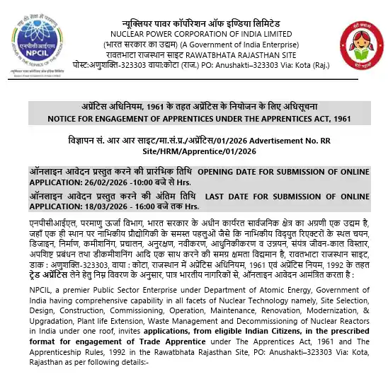 NPCIL Rajasthan Commerce Apprentice Recruitment 2026: अगर आपने भी हालही में ITI डिप्लोमा किया है और अब सरकारी न्यूक्लियर पावर कंपनी में ट्रेनिंग लेकर अच्छी स्किल्स सीखना चाहते हैं, तो आपके लिए एक अच्छी खबर आ गई है। आपको बता दें कि Nuclear Energy Company of India Restricted (NPCIL) ने 26 फरवरी 2026 को अपनी आधिकारिक वेबसाइट पर एक अधिसूचना जारी की है। इस अधिसूचना में Commerce Apprentice के कुल 245 स्लॉट्स के लिए आवेदन मांगे गए हैं।