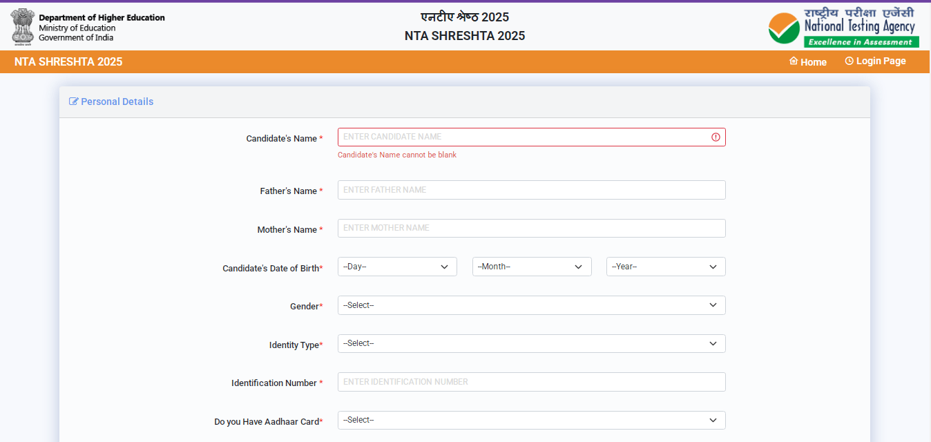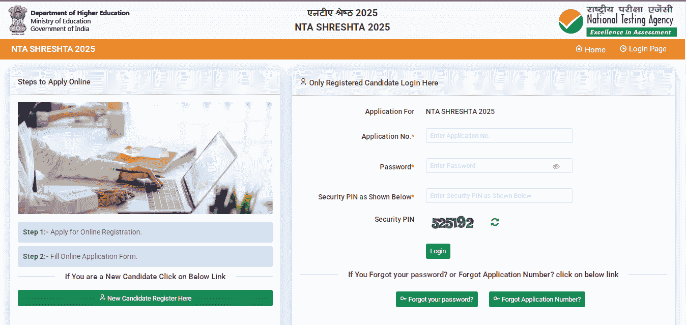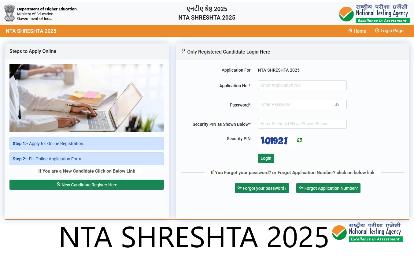 स्टेप 2 – पोर्टल मे लॉगिन करके NTA SHRESHTA 2025 हेतु ऑनलाइन अप्लाई करें