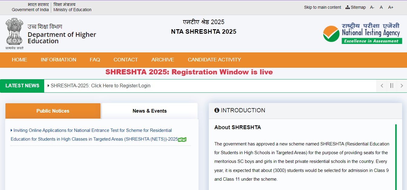 एनटीए ने श्रेष्ठ 2025 / SHRESHTA (NETS) 2025 का नोटिफिकेशन किया जारी, जाने कब से कब तक करना होगा रजिस्ट्रैशन और क्या है अप्लाई करने की लास्ट डेट – NTA SHRESHTA 2025?