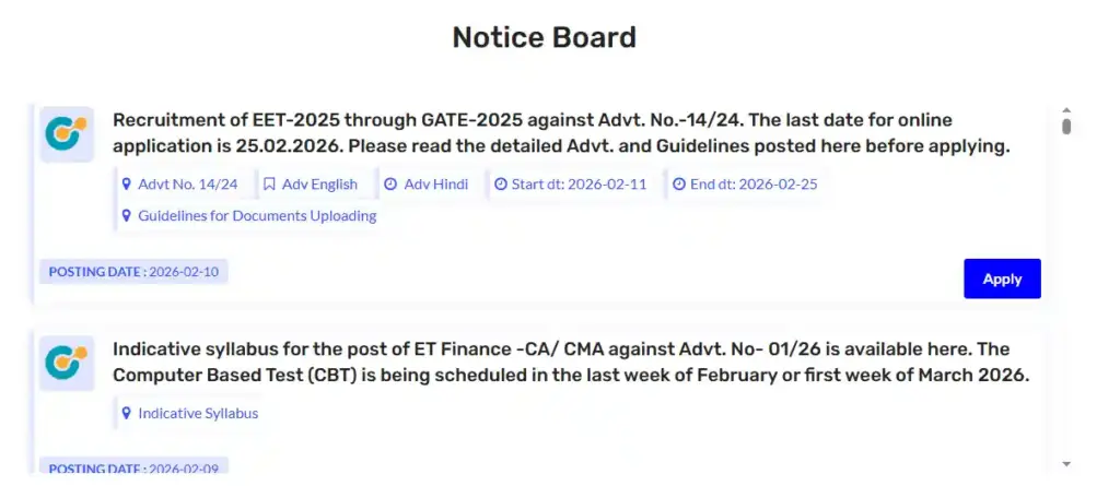 - इस वेबसाइट में आने के बाद ‘Discover Board’ सेक्शन में ‘Recruitment of EET-2025 by means of GATE-2025 in opposition to Advt. No.-14/24. The final date for on-line software is 25.02.2026. Please learn the detailed Advt. and Tips posted right here earlier than making use of’ की ऑप्शन के नीचे ‘Apply’ पर क्लिक करें।