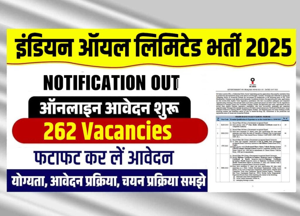 OIL India Workpersons Recruitment 2025: अगर आप भी 10वीं या 12वीं पास है औऱ इंडियन ऑय़ल लिमिटेड मे ग्रेड 3, 5 या 7 के तहत अलग वर्कपर्सनन्स के पदो पर नौकरी प्राप्त करके अपना करियर बनाना चाहते है Oil India Restricted (OIL) द्धारा 18 जुलाई, 2025 के दिन रिक्त कुल 262 पदों पर भर्ती विज्ञापन जारी करते हुए OIL India Workpersons Recruitment 2025 को जारी किया है जिसमे सभी आवेदक 18 जुलाई, 2025 से लेकर 18 अगस्त, 2025 तक अप्लाई कर सकते है।