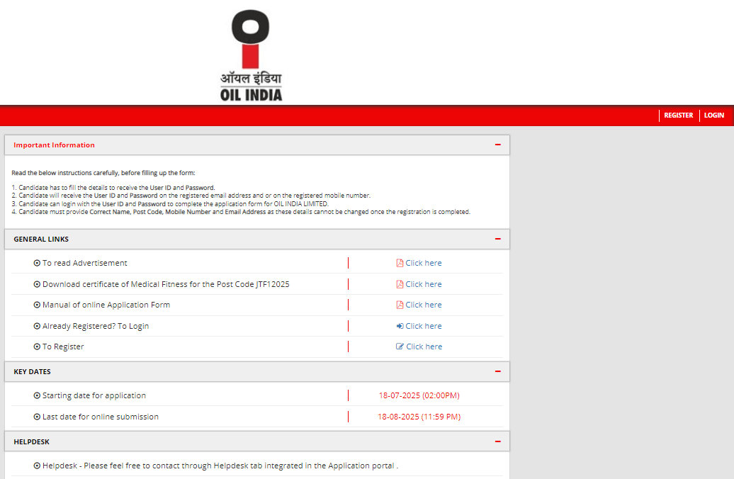 सभी अभ्यर्थी जो कि, OIL India Workpersons Recruitment 2025 मे आवेदन करना चाहते है वे 18 जुलाई, 2025 से लेकर 18 अगस्त, 2025 तक आवेदन कर सकते है।