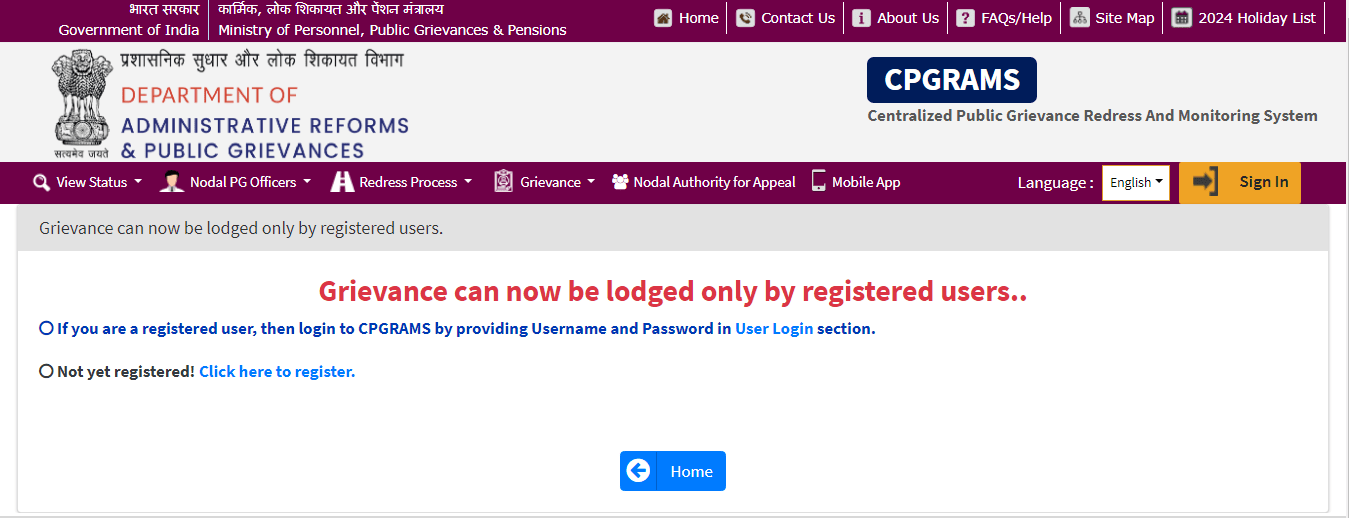 - PG Portal Grievance Registration अर्थात् PG Portal Me Grievance Kaise Kare के लिए सबसे पहले आपको इसकी Official Web site के होम – पेज पर आना होगा जो कि, इस प्रकार का होगा –