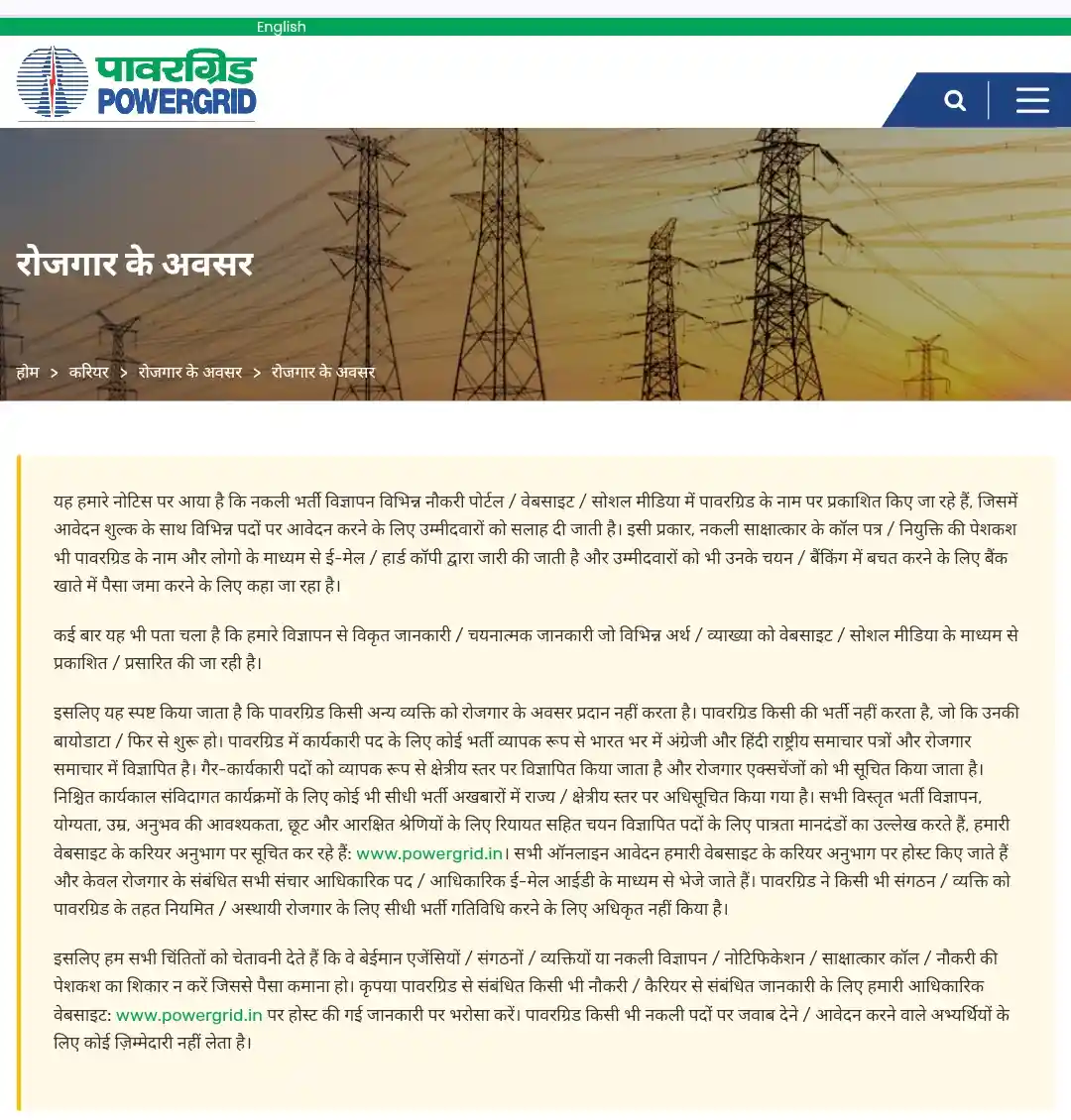 PGCIL Field Supervisor & Engineer Recruitment 2025 Official Website Screenshot.