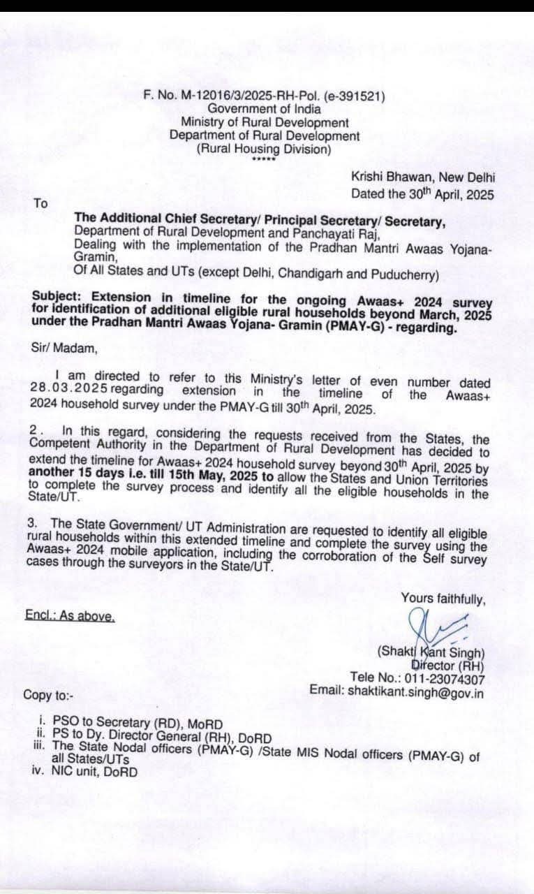 पहले PM Gramin Awas Survey Type 2025 भरने की अन्तिम तिथि 30 अप्रैल, 2025 थी जिसे बढ़ाकर अब 15 मई, 2025 कर दिया गया है।