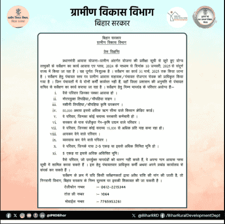 • PM Awas Yojana Self Survey 2025: खुद से पी.एम ग्रामीण आवास योजना मे सर्वे कैसे करें और स्टेट्स चेक, जाने किन परिवारोें का नाम जोड़ा जाएगा