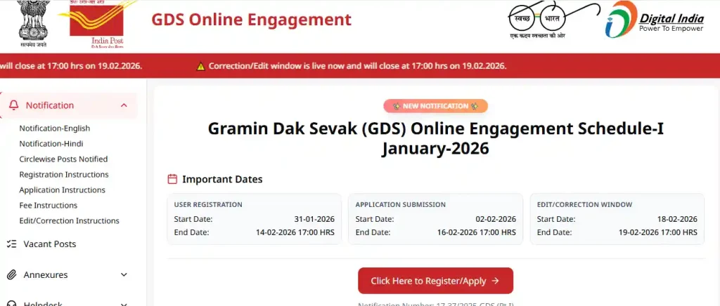 - नई वेबसाइट ओपन होगी, यहाँ पर ‘Gramin Dak Sevak (GDS) On-line Engagement Schedule-I January-2026’ के नीचे आपको ‘Click on Right here to Register/Apply’ की ऑप्शन देखेगी, उस पर क्लिक करें।
