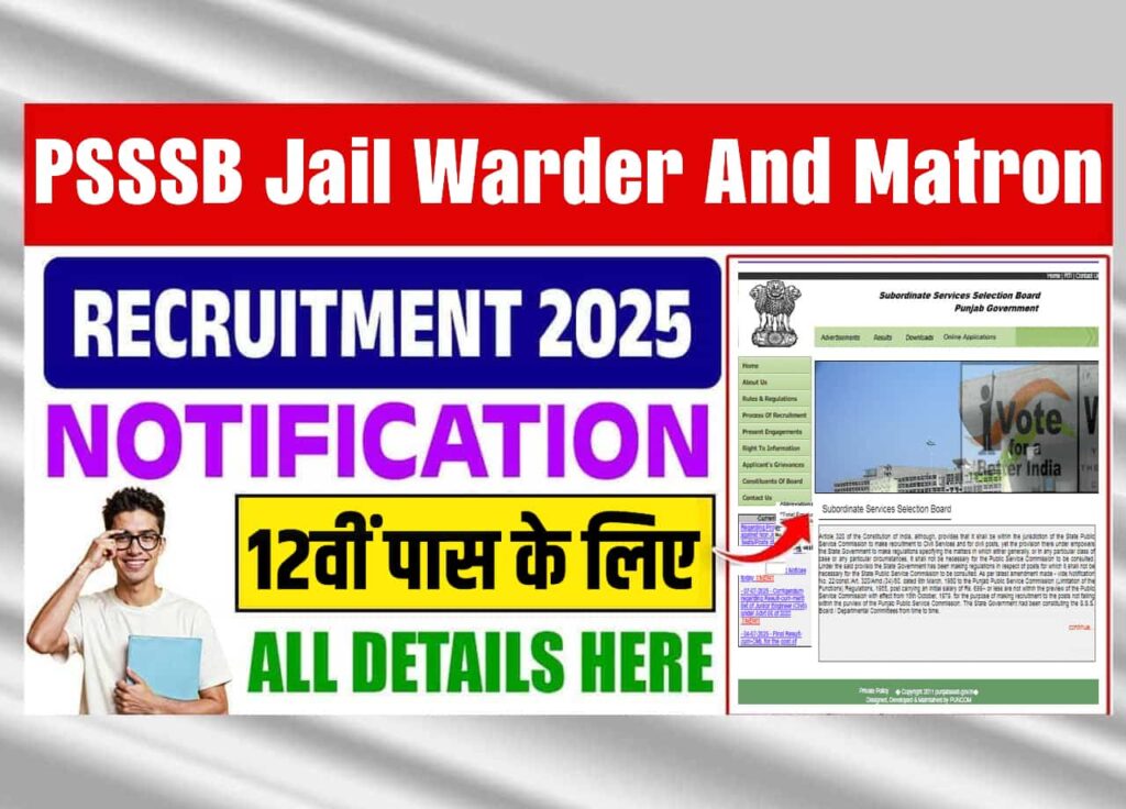PSSSB Jail Warder And Matron Recruitment 2025: 12वी पास वे सभी युवा व आवेदक जो कि, पंजाब अधीनस्थ सेवा चयन बोर्ड के तहत जेल वार्डर और मैट्रोन के पदों पर सरकारी नौकरी प्राप्त करना चाहते है यदि हां तो आफके लिए अच्छी खबर है कि, Punjab Subordinate Providers Choice Board (PSSSB) द्धारा 29 जुलाई, 2025 को रिक्त पदों पर नया भर्ती नोटिफिकेशन जारी किया गया है जो कि, आपके लिए नौकरी पाने के बेहतर अवसर साबित हो सकता है और इसीलिए आपको लेख मे PSSSB Jail Warder And Matron Recruitment 2025 की जानकारी प्रदान की जाएगी।