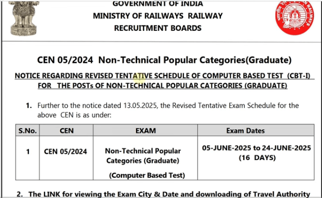 RRB NTPC CBT 1 Admit Card for graduate posts is being issued from June 1, 2025. The admit card is launched on the region-wise official web sites of RRBs