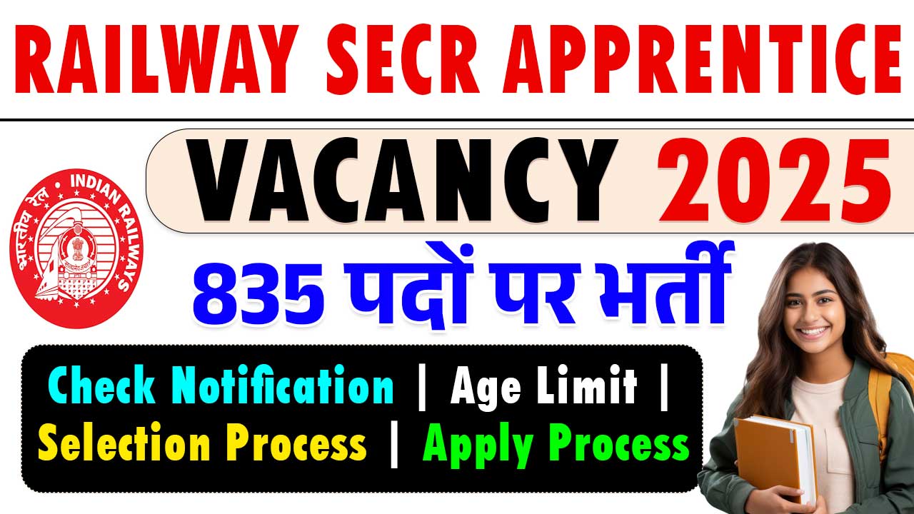 Railway SECR Apprentice Vacancy 2025 – रेलवे में अप्रेंटिशिप के 835 पदों पे भर्ती, जाने Online प्रक्रिया, Fee, Eligibility & More Info.